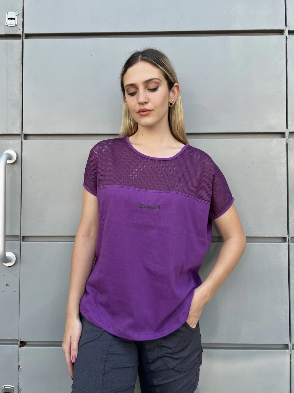 La Remera Elsa está confeccionada en jersey de algodón peinado; su diseño incluye una combinación de red en la parte superior del frente, aportando un estilo moderno y fresco.